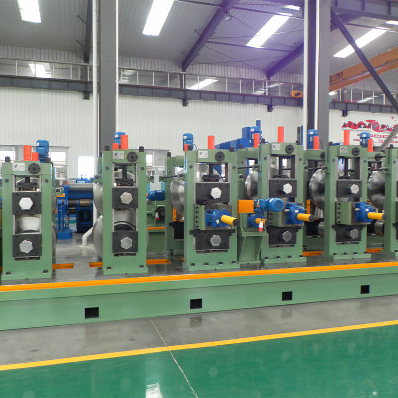 Esta máquina para fabricar tubos ERW nivela la tira fija después de la línea de corte y la introduce en la máquina formadora. La tira se dobla en forma de tubo mediante rodillos, y los bordes se funden mediante corriente de alta frecuencia y se sueldan mediante rodillos exprimidores. También conocido como molino de tubos de alta frecuencia.